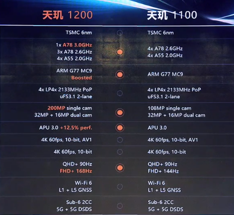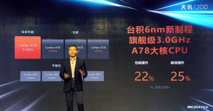 最新发布的天玑1200采用台积电6nm新制程,采用1+3+4的旗舰级三丛架构设计,1个 3.0GHz的旗舰级 Cortex-A78大核、3个2.4GHz的 Cortex-78和4个2.0 GHz的Cortex-A55,与天玑1000+相比,性能提升22%,能效提升25%。
