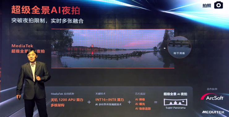 李俊男介绍,利用天玑1200搭载的APU3.0,结合AI多任务调度机制,通过AI降噪、AI曝光、AI物体追踪等AI技术的高度融合,可以带来“急速夜拍”和“超级全景夜拍”等拍照新体验。同时,充分发挥APU 3.0混和精度优势,灵活运用整数精度与浮点精度运算,达到更高的AI应用能效。