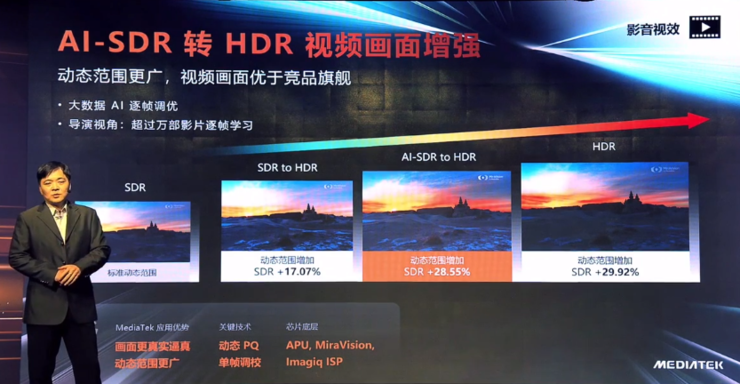 天玑1200还能利用AI技术实现画质增强,通过AI对大量影片的深度学习,从导演视角对视频画面进行逐帧调教,为SDR片源带来接近HDR的动态范围。