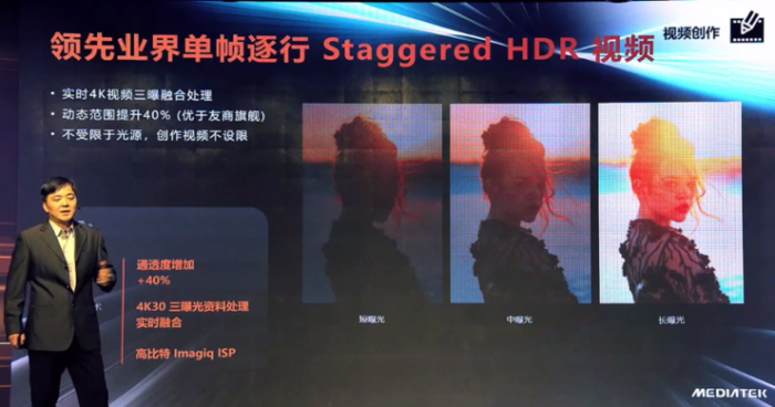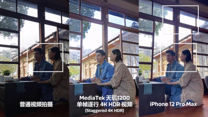 AI视频应用方面,借助强大的AI性能,结合多人实时分割技术,可实现多人的背景替换、多路人移除等手机视频拍摄特效。不仅如此,天玑1200还支持芯片级单帧逐行4K HDR视频技术(Staggered HDR),在用户录制4K视频时,对每帧画面进行3次曝光融合处理,让视频画质拥有出色的动态范围,从发布会展示的视频看,视频的色彩、对比度、细节等方面有明显提升。
