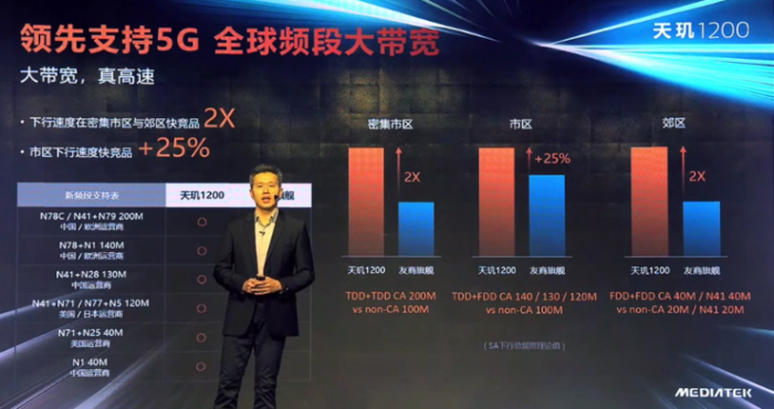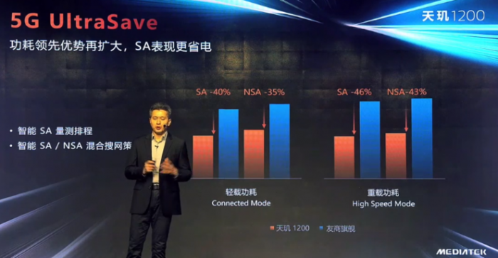 MediaTek给出的数据显示,性能方面,天玑1200的5G速度相比友商旗舰高40%,下载峰值速率为4.7Gbps,上行峰值速率为2.5Gbps。省电方面,MediaTek的5G UltraSave使用智能SA量测排程与智能SA/NSA混合搜网策略,SA/NSA表现更省电,轻载功耗和重载功耗相比友商旗舰均有所下降。