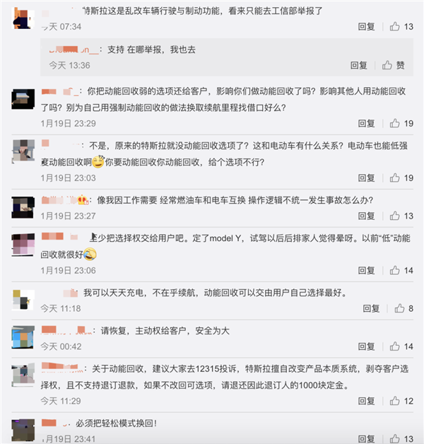 此外,还有网友表示:特斯拉此举是在自行乱改车辆行驶与制动功能,要去工信部举报。另有网友称,特斯拉此举是为了增加车辆的续航,因而强制所有车主,使用动能回收功能。
