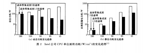 随着工艺节点的进步,静态功耗的重要性逐渐显现。从英特尔和IBM的芯片工艺发展中可以看出,在工艺制程从180nm到45nm的演进过程中,晶体管集成度增速不同,动态功耗或增加或减少,但静态功耗一直呈上升趋势, 45nm时,静态功耗几乎与动态功耗持平。