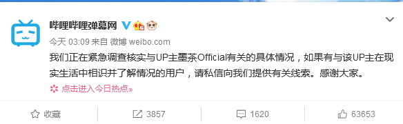 目前,B站官方也发布公告:我们正在紧急调查核实与UP主墨茶Official有关的具体情况,如果有与该UP主在现实生活中相识并了解情况的用户,请私信向我们提供有关线索。感谢大家。