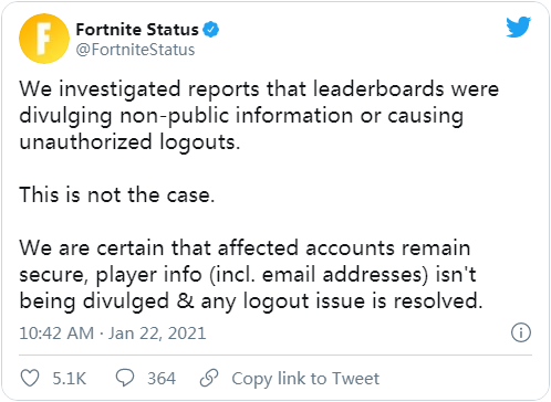 但是 Epic Games 的调查发现,事实上并没有发生 Yung Calc 所怀疑的潜在问题,玩家们的账户数据并未发生任何形式的泄露。