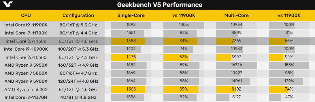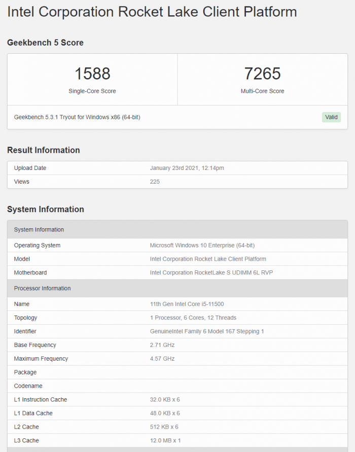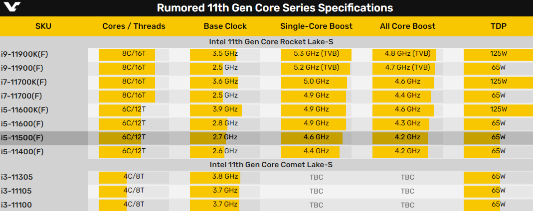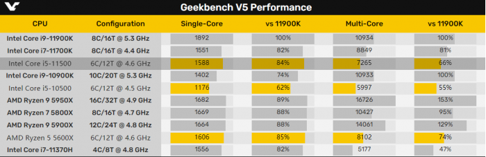 随着发布时间的临近,Intel Rocket Lake 11代酷睿的正式版本也陆续现身基准测试软件。昨天见识了高端的i9-11900K、i7-11700K之后,今天又在GeekBench 5里看到了主流的i5-11500。一如传闻,i5-11500的规格为6核心12线程,3MB二级缓存,12MB三级缓存,基准频率2.7GHz,最高加速4.6GHz。