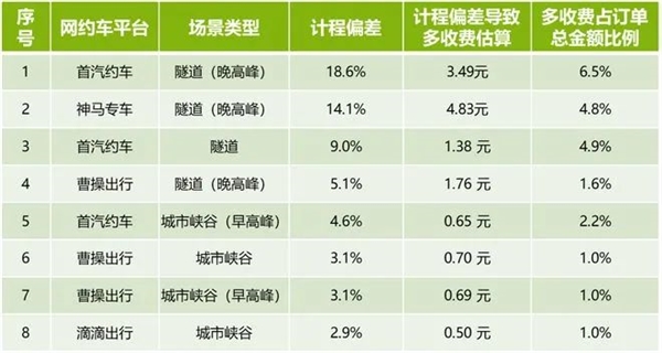 其中,本次计程正偏差最大的8次测试,会导致消费者被多收费0.5-4.8元,占订单总金额的比例大致在1-6.5%。