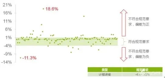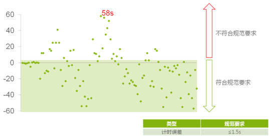 在计时方面,110次测试的计时误差范围在-57s至58s之间。规范要求计时误差≤1.5s,有35次计时误差不符合要求。