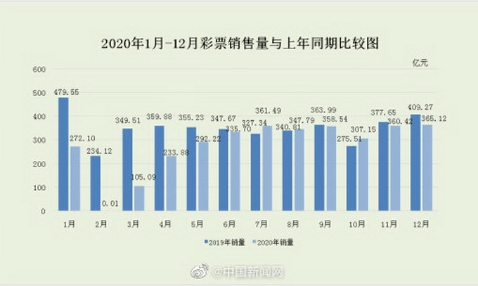 2020年12月,全国共销售彩票365.12亿元,同比去年减少44.16亿元,下降10.8%。其中,福利彩票机构销售152.69亿元,同比减少34.88亿元,下降18.6%;体育彩票机构销售212.42亿元,同比减少9.27亿元,下降4.2%。