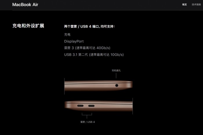 接口方面Macbook Air带有一个3.5mm音频接口,两个全功能雷雳/USB 4接口。两个雷雳/USB 4接口均支持充电输入,运行在雷电3模式时速率可达40Gbps,并向下兼容USB3.1 10Gbps。