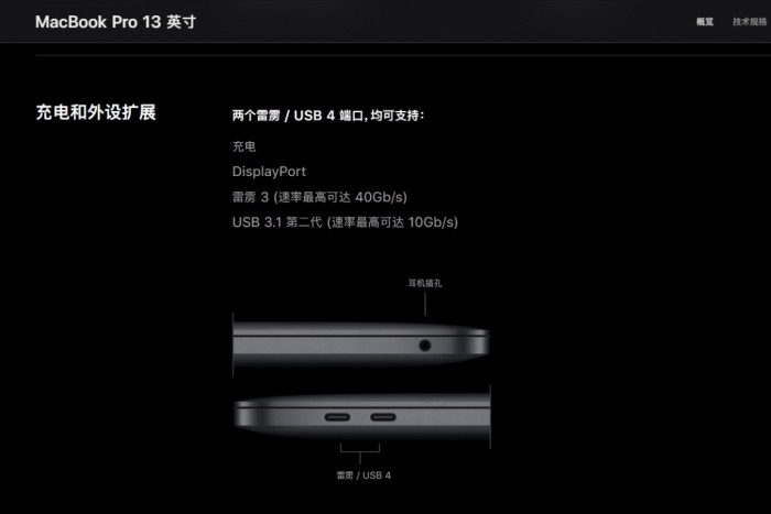 接口方面Macbook Pro 13带有一个3.5mm音频接口,两个全功能雷雳/USB 4接口。两个雷雳/USB 4接口均支持充电输入,运行在雷电3模式时速率可达40Gbps,向下兼容USB3.1 10Gbps。