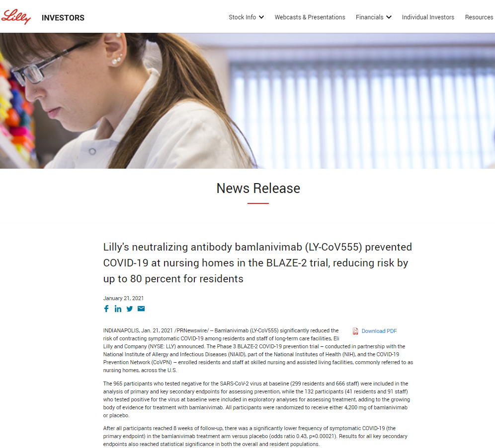 礼来公司曾着手进行一项实验,看看它的新冠治疗方法--一种含有所谓单克隆抗体的药物--是否可以用来预防工作人员和养老院的居民感染COVID-19。这项研究是与美国国家卫生研究院合作进行的,它似乎已经起了作用--它防止了接触新冠病毒的居民的症状感染。