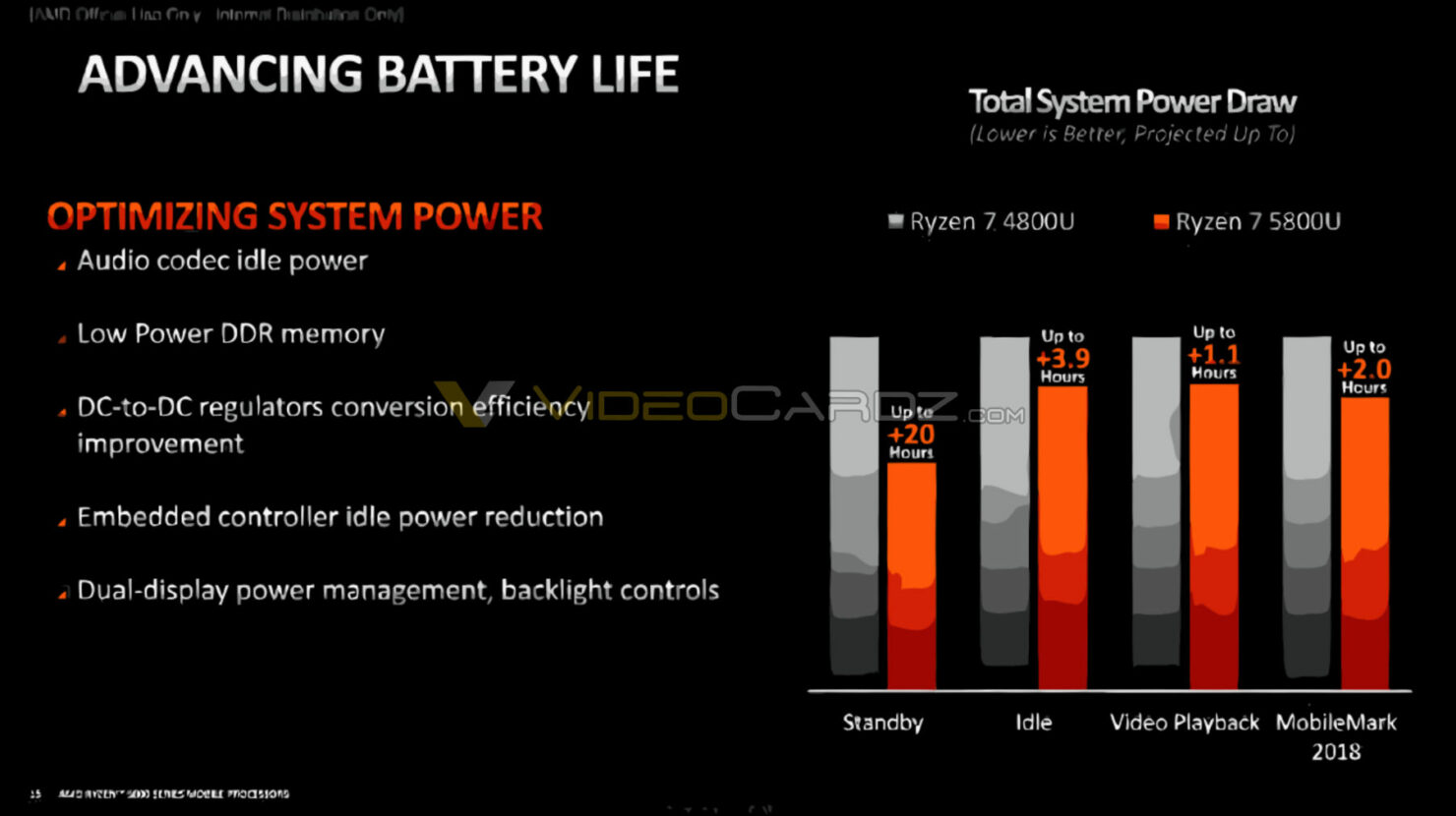 得益于此,Cezanne APU 的待机增加了 20 小时,闲置续航增加了将近 4 小时,视频播放增加了 1.1 小时,常规用例也增加了 2 小时。此外在锐龙 5000 桌面平台,AMD 也为 Zen 3 处理器运用了类似的配置(比如深度电源状态)。