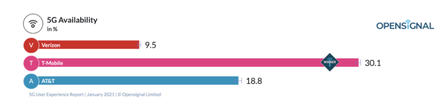 根据市场研究公司Opensignal的最新报告显示,美国三大主要电信运营商的5G平均下载速度仅为47-58Mbps,其中T-Mobile US在5G下载速度方面保持领先。据悉,Opensignal这一调查结果源于其对2020年9月至12月期间上亿部终端设备在美国各家主要电信运营商网络上使用情况的分析。