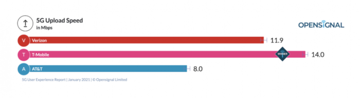在5G上行速度方面,T-Mobile US再次成为三家公司中的胜者,其5G上行速度为14.0Mbps,排在其后的Verizon为11.9Mbps,AT&T则为8.0Mbps。