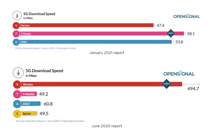 基于这些数据,T-Mobile US打败了另外两家运营商Verizon和AT&T,以58.1Mbps的5G平均下载速度领先。而在2020年6月当时,T-Mobile US的5G平均下载速度为49.2Mbps。