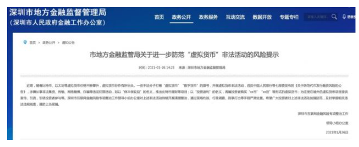 1月26日消息,据深圳市地方金融监督管理局官网发布的消息,深圳市互联网金融风险等专项整治工作领导小组办公室发布关于进一步防范“虚拟货币”非法活动的风险提示。