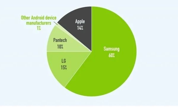 7 年前,三星、LG 与泛泰(Pantech)三大品牌共占据了接近 85% 的智能手机市场份额,其中三星更是凭借 60% 的占有率“一骑绝尘”,即使是苹果在韩国市场中也只有不到 15% 的市场份额。