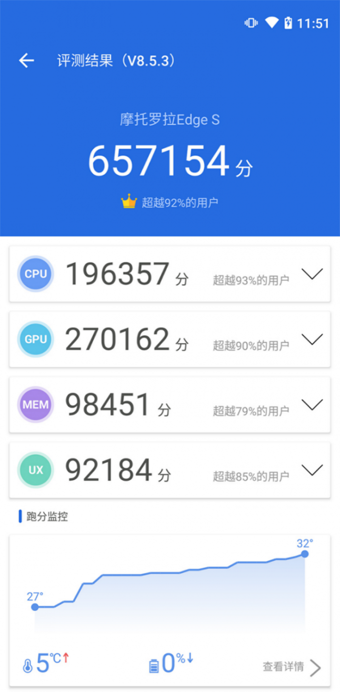 配置方面,motorola edge s首发了新一代旗舰高通骁龙870,高通骁龙870是目前高通推出的最新一代旗舰级5G芯片,高通骁龙870采用了7nm制作工艺,CPU采用Kryo 585八核架构,主频最高提升至3.2GHz;GPU采用Adreno 650;支持Wi-Fi6及蓝牙5.1音频技术;采用第五代AI引擎,支持15 TOPS的算力的同时带来更低功耗,在实际跑分体验中我们使用安兔兔跑分超过65万,在旗舰机跑分上处于一线阵营。