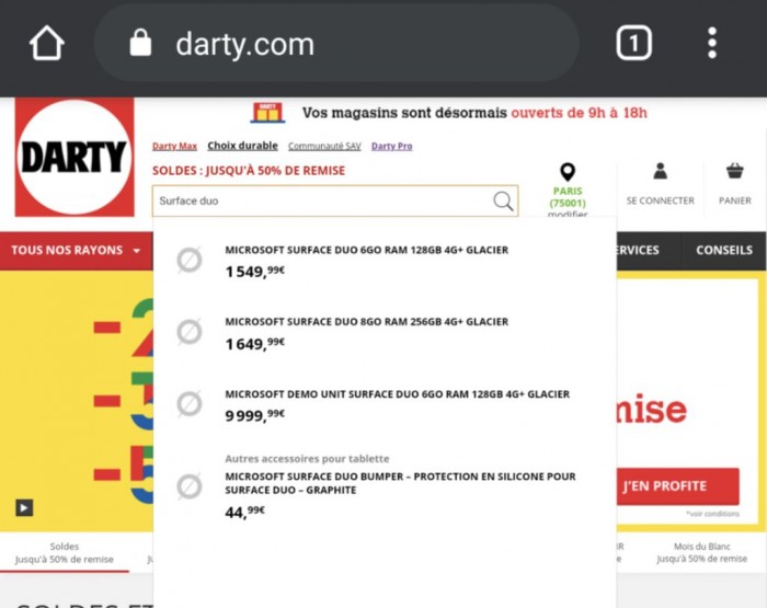 根据知名社区 Reddit 上用户爆料,微软旗下唯一的智能手机 Surface Duo 即将登陆欧洲市场。目前该设备已经现身法国零售商城 Darty.com,不仅罗列了两种规格的售价,而且还提供了美国版本所没有的配置--8GB的内存。