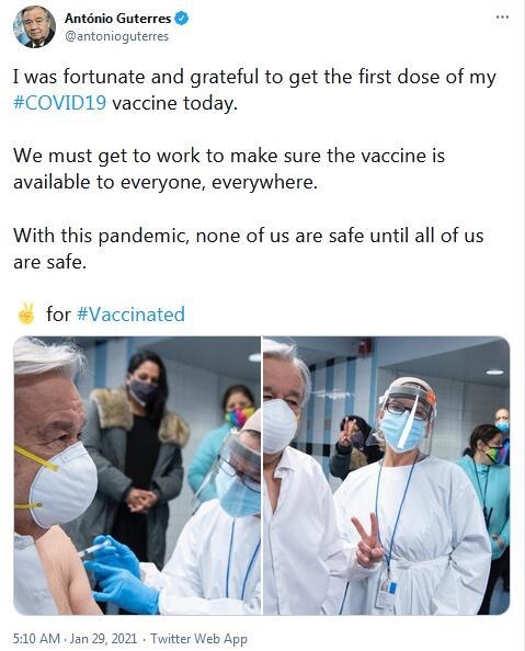 随后这个消息引起了全球网友的围观,而在推文中,古特雷斯称:“今天,我很幸运并且很感激地接种了我的第一剂次新冠疫苗。我们必须开始工作,确保每个人、任何地方都能获得疫苗。在这场大流行中,只有我们所有人都安全了,我们每一个人才会安全。”