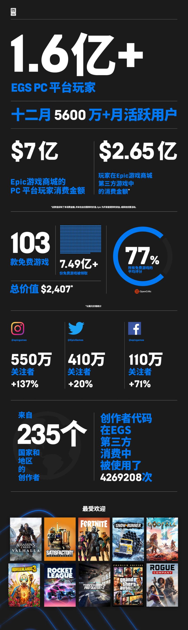 2020年Epic送出103款免费游戏,总价值2407美元,超过7.49亿份免费游戏被领取,所有免费游戏的平均评分达77%。