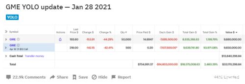 GME的交易之后,吉尔Gill在Reddit上宣布,仅当日他就亏损了1480万美元。