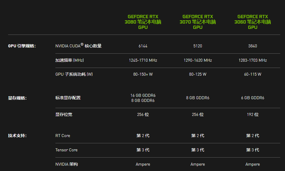 RTX 3060笔记本显卡集成3840个流处理器,核心频率范围1283-1703MHz,功耗范围60-115W,搭配192-bit 6GB GDDR6显存,也支持光线追踪、DLSS抗锯齿、第三代Max-Q(但不会标注)等技术。
