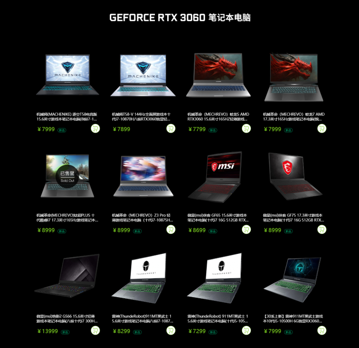 首批上市的RTX 3060笔记本有4家厂商的13款型号,包括15.6/17.3英寸两种典型尺寸,有趣的是处理器无一搭配AMD锐龙5000H系列或者Intel 11代酷睿H系列,其中绝大部分都是10代酷睿H,只有机械革命的两款上了锐龙4000H。