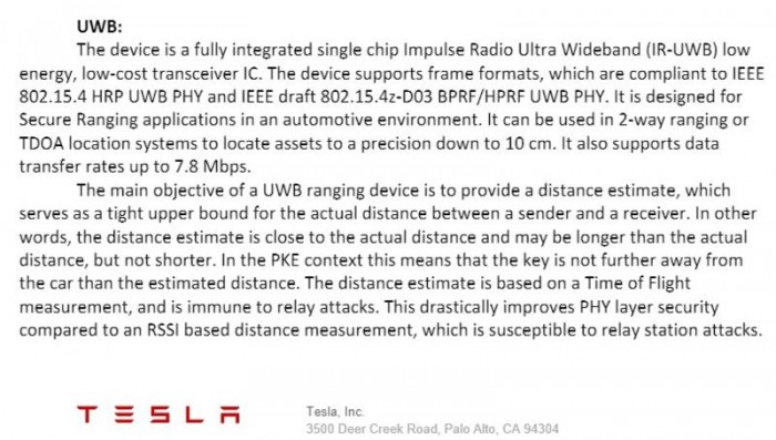 这份文档是在去年 9 月提交给 FCC 的,概述了全新车钥匙、控制器、可安装到汽车框架和驾驶室内终端等内容,其中部分元件支持 Ultra Wideband 技术。特斯拉使用的是基于标准的 Ultra Wideband 实现方式,因此如果最终出现在特斯拉汽车上,应该可以兼容支持该技术的 iPhone 11 和 iPhone 12 机型。