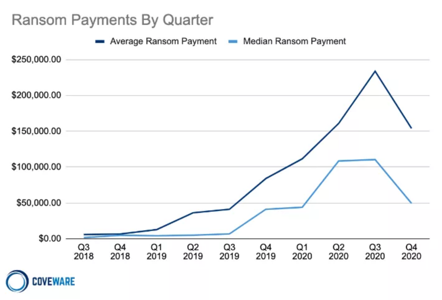 至于勒索软件的攻击载体,电子邮件钓鱼现在已经超过远程桌面协议(RDP)攻击成为最流行的网络攻击,其在Q4占比超过了50%。不过利用泄露的凭证的RDP仍非常流行,因为员工用户名和密码的勒索价低至50美元。