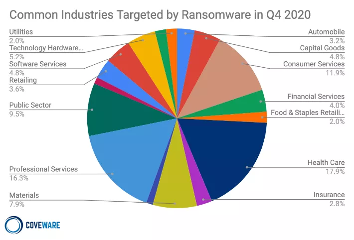 专业服务则是第二大最常见的勒索软件罪犯的目标行业--占比16.3%,仅次于医疗保健--占比17.9%。长期以来,医院和健康中心一直是犯罪分子认为他们更愿意掏钱的常见目标。随着疫情的蔓延,这些组织已经濒临崩溃的边缘,勒索软件的攻击则可能会造成生命的损失。