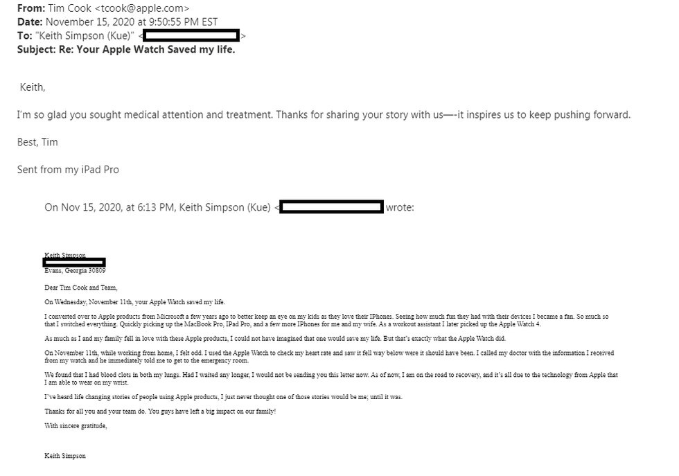 后来,Simpson给苹果CEO蒂姆-库克发了一封邮件,讲述了该公司的产品是如何挽救了他的生命。这位高管及时做出了回应。根据之前的报道,Apple Watch Series 7将包含血糖监测功能。此外,据传苹果还将在未来的可穿戴设备上测试血压监测功能。