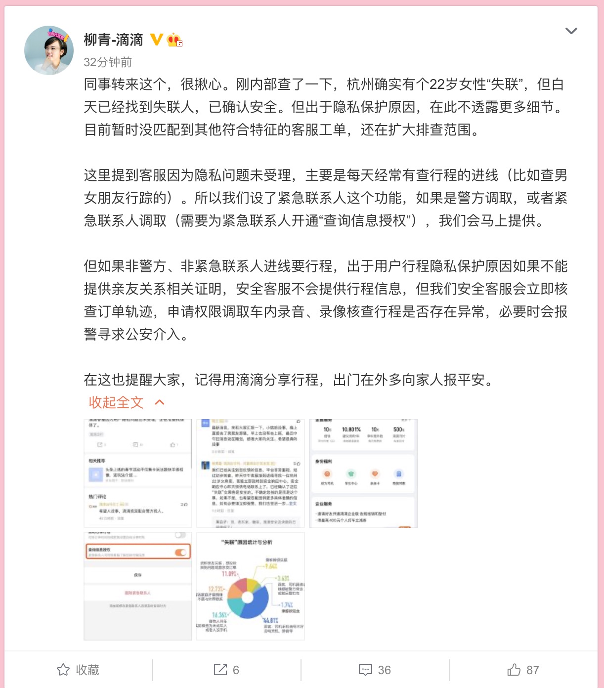 柳青在微博中针对“客服因隐私问题未受理”一事进行回应,表示每天经常有类似于查男女朋友行踪的电话进来,所以滴滴设置了紧急联系人功能,如果警方或紧急联系人调取,滴滴将马上提供形程。若非警方、非紧急联系人进线进线要行程,出于用户行程隐私保护原因如果不能提供亲友关系相关证明,安全客服不会提供行程信息,但滴滴会进行相关核查,必要时将报警寻求公安介入。