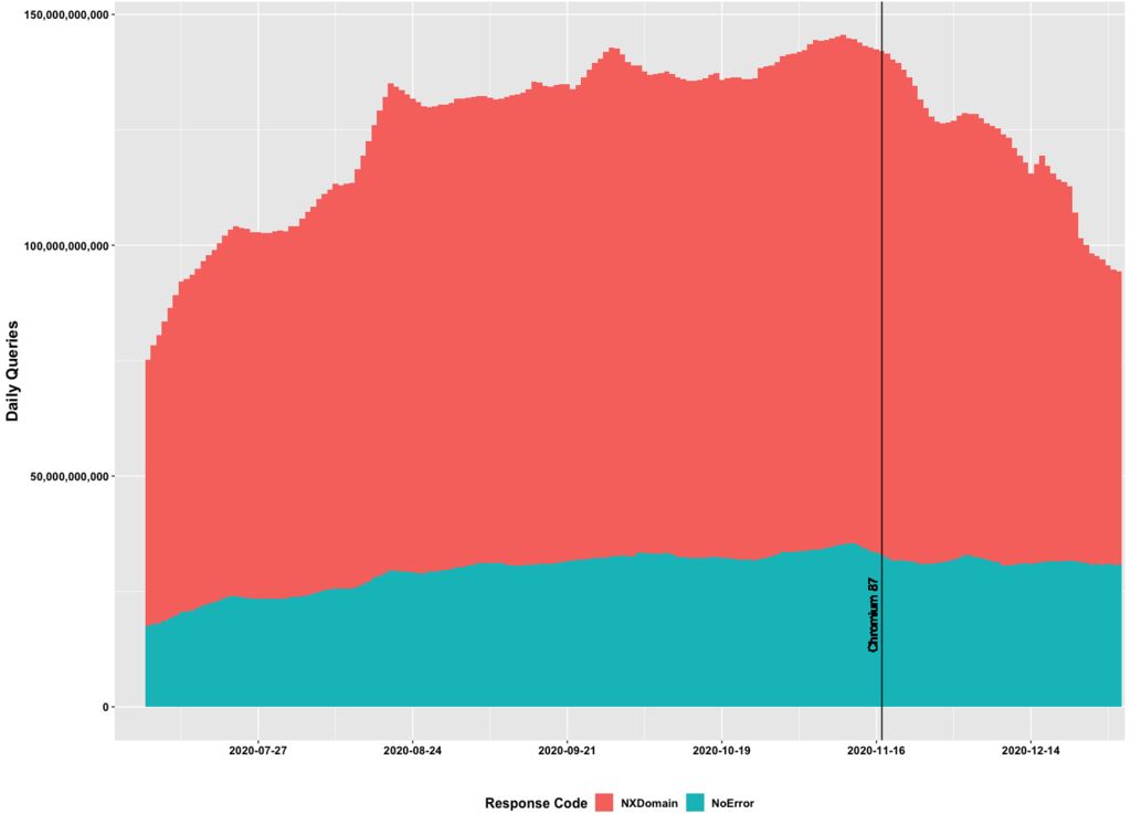 下图突出显示了 Chromium 87 发布后,根服务器系统的查询量立即大幅下降。在该软件发布之前,根服务器系统的查询量峰值为每天约 1430 亿次。此后,流量已降至每天约 840 亿次查询。这意味着总查询量减少了 41% 以上。