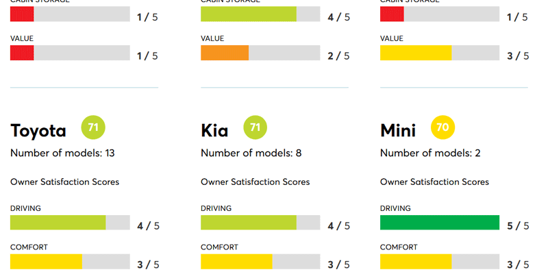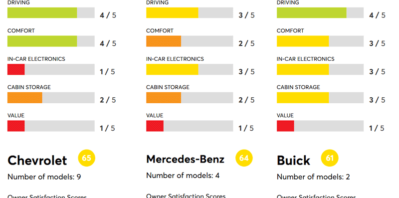 自然有些汽车品牌并不令人满意,凯迪拉克和英菲尼迪分别以 59 分和 48 分排在最末尾。虽然有部分车型的评价还不错,但是整体上来说这两个品牌的满意度很低。