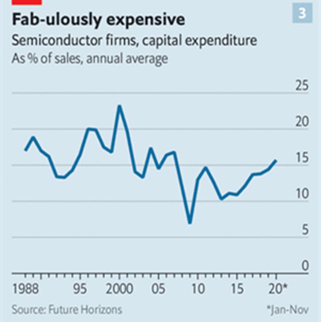 图3芯片行业资本支出在下降过后,再度开始回升。截图自《经济学人》数据来源:Future Horizons