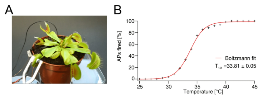 Dionaea muscipula捕蝇草由双叶捕虫叶组成,叶子上有敏感的刺毛,当触及时,会触发动作电位,并传遍整个捕蝇草。在连续两次刺激后,陷阱关闭,任何潜在的昆虫猎物都被锁在里面,随后被消化。有趣的是,陷阱以各种方式进行电激发:除了机械影响,如触摸或伤害,渗透能,例如盐水负载,以及热或冷的形式的热能也可以触发动作电位。