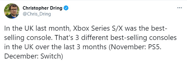 “上个月英国,XSX/S是最畅销的主机。过去三个月三种不同的机种制霸:11月是PS5,12月是Switch,1月是XSX/S。”