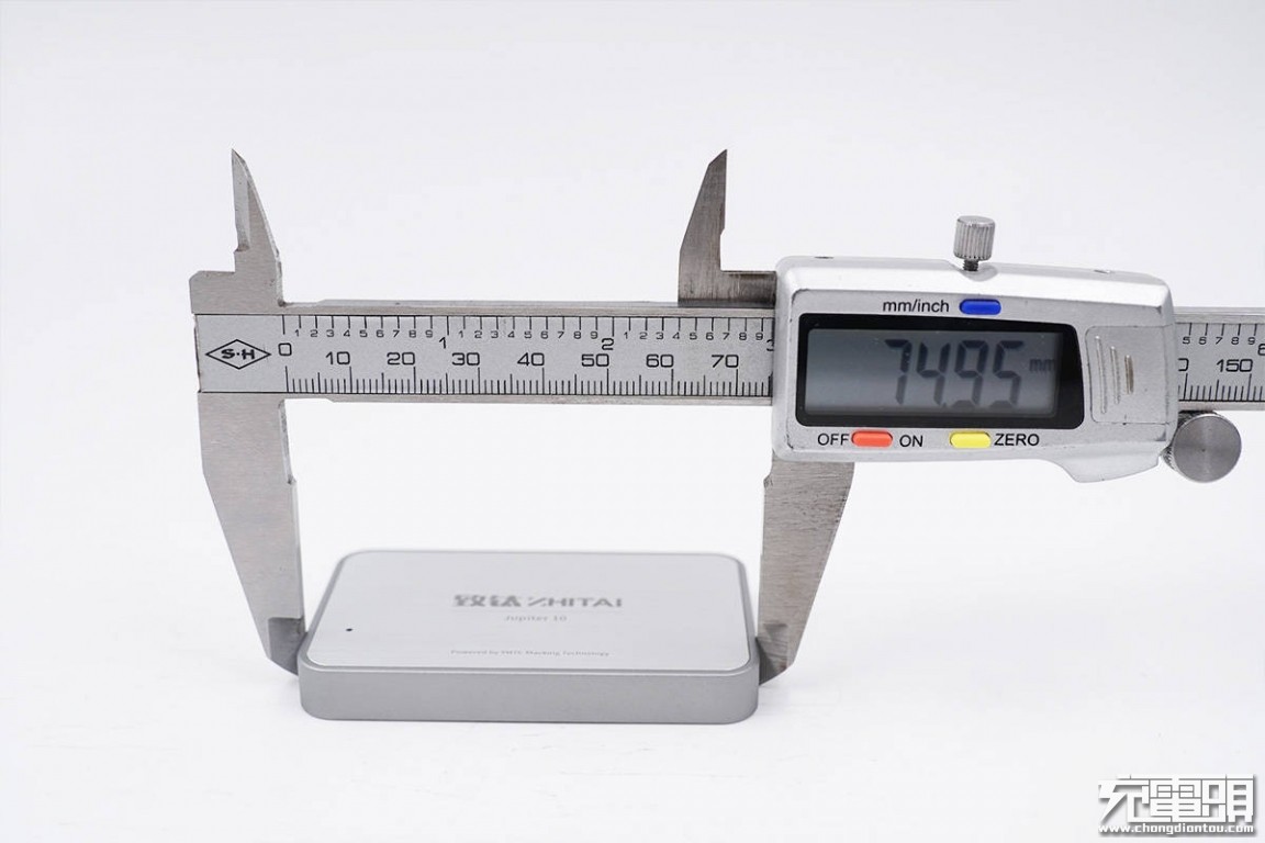 使用游标卡尺实测硬盘机身长度为74.95mm。