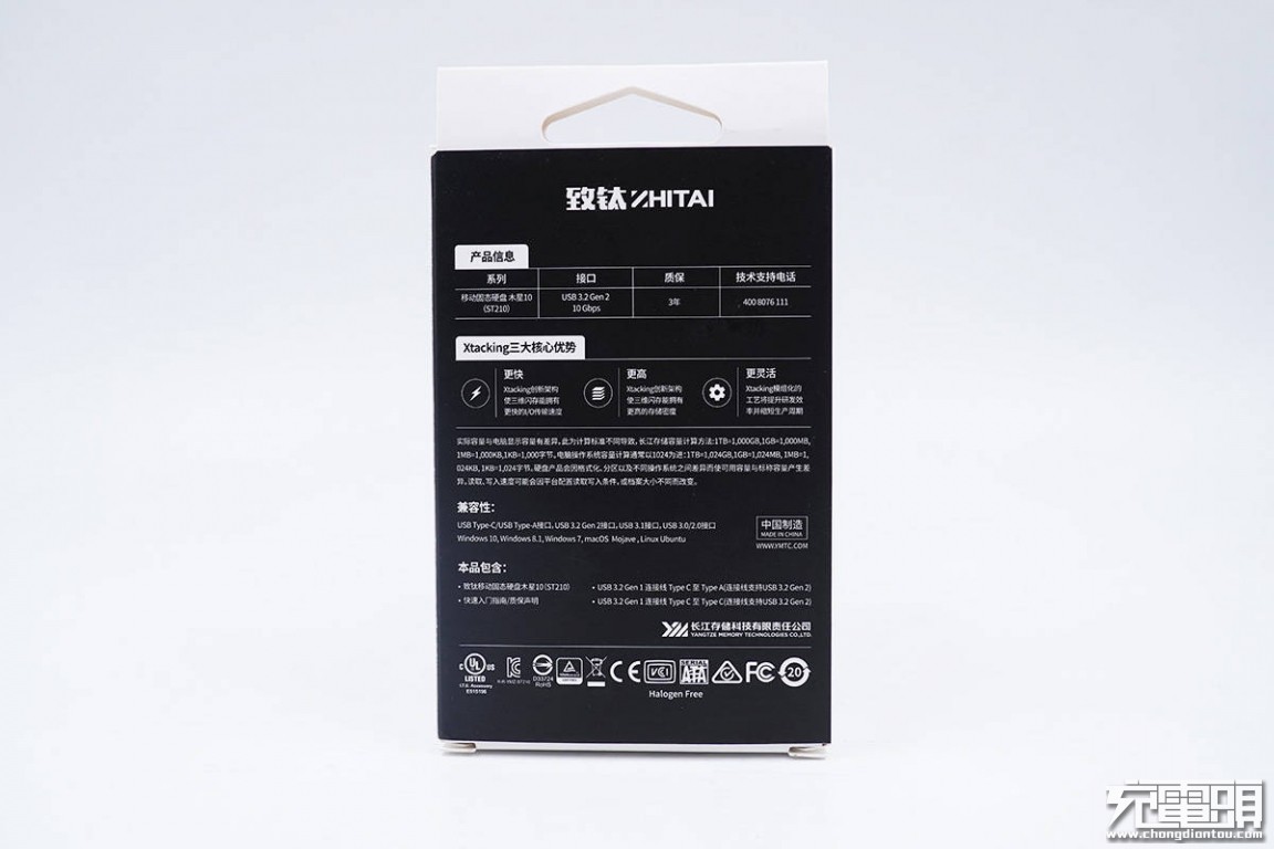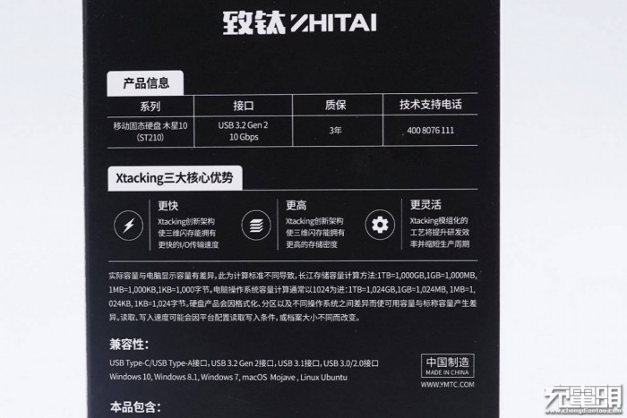 包括产品基本信息、Xtacking三大核心优势以及兼容性等。USB-C接口为USB3.2 Gen2,10G速度,硬盘内部为SATA接口,最大传输速度为6Gbps。