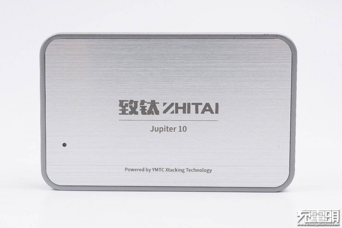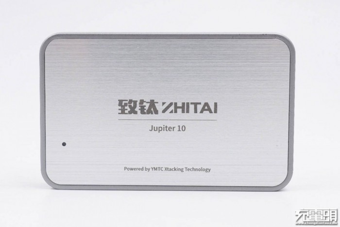 顶面中心镭雕致钛ZHITAI品牌和Jupiter10名称,下方是Powered by YMTC Xtacking Technology字样,左侧设有LED指示灯。