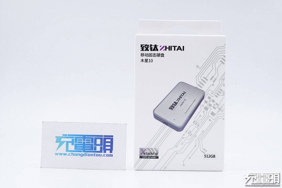 包装盒正面印有ZHITAI致钛品牌、硬盘名称、外观和电路图和512GB容量,并印有Xtacking标签。