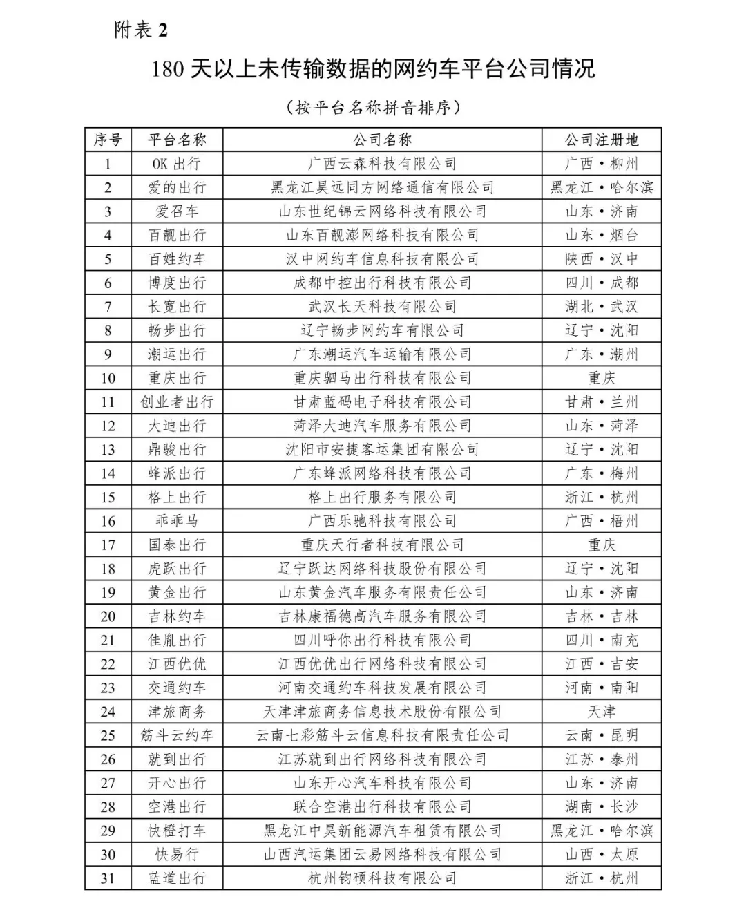 新增5家已累计180天未传输数据的网约车平台公司,包括:南京同游天下汽车租赁有限公司(秒走打车)、汉中网约车信息科技有限公司(百姓约车)、成都中控出行科技有限公司(博度出行)、杭州钧硕科技有限公司(蓝道出行)、华夏老兵出行吉林集团有限公司(老兵出行)。