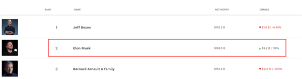 福布斯实时富豪榜显示,马斯克身家1865亿美元,位居全球第二,仅次于亚马逊创始人杰夫·贝佐斯。