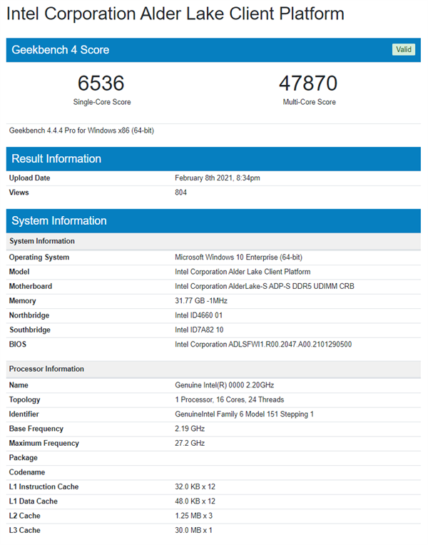 Intel将在下半年发布的Alder Lake 12代酷睿将第一次在桌面引入10nm工艺、大小核混合设计,第一次为消费级平台带来DDR5内存,还会更换新的接口。Alder Lake的样品已经不止一次出现在GeekBench、SiSoftware等测试数据库中,而最新冒出来的这个非常好玩。