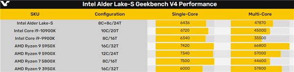 跑分方面,GeekBench 4版本已经没有排行榜,就选取了一些型号的中位数成绩,简单对比下。这颗16核心24线程的Alder Lake样品,单核性能落后i9-10900K 4%左右,多核心则领先6%左右,如果对比i9-11900K肯定都会落于下风。