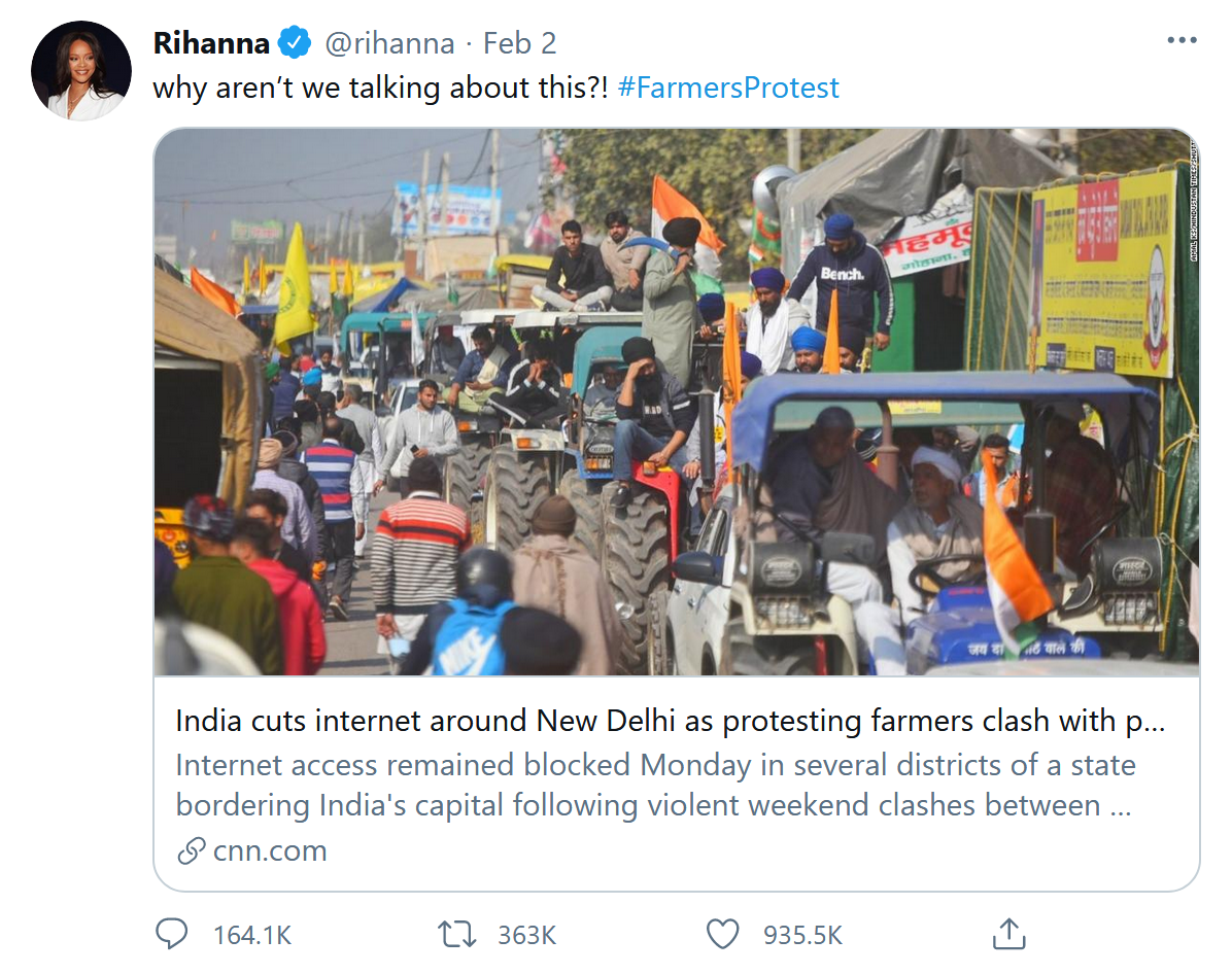 美国歌手蕾哈娜在Twitter上的粉丝比印度任何一名演员或政客都多,她上周在CNN发了一则关于抗议活动的新闻报道转发并问道道:“我们为什么不讨论这件事!?”印度政府坚持认为,新法律旨在通过简化农业供应链来帮助农民和消费者。上个月,新德里还暂时关闭了首都及周边抗议活动发生地附近的互联网服务。