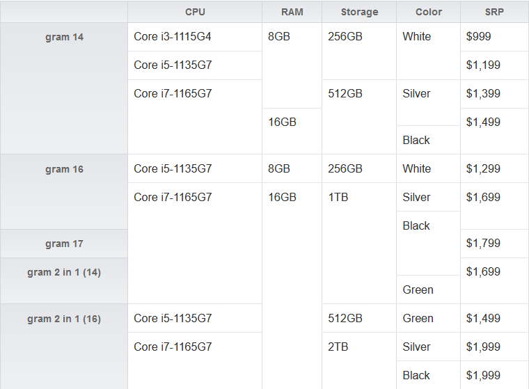 这些机型主打高端超便携领域,Gram 14配置起价999美元,Gram 16机型起价为1299美元,而单一配置机型Gram 17则为1799美元。最后一款机型只有黑色,而16英寸和14英寸的对应机型有白色和银色外壳可供选择。