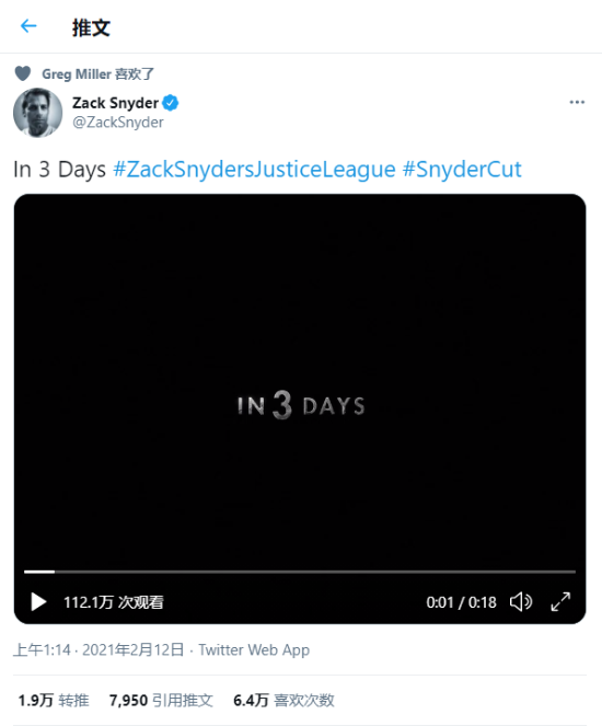 扎导今天早些时候在推特上公布了《正义联盟-导演剪辑版》的先导预告,正式预告还有3天到来。正式预告片将在太平洋时间2月14日上午9:14分(即北京时间2月15日凌晨1:14分)公开。 《正义联盟》导演剪辑版预计将于3月18日在HBO max上映,据称本片时长将达到4个小时。